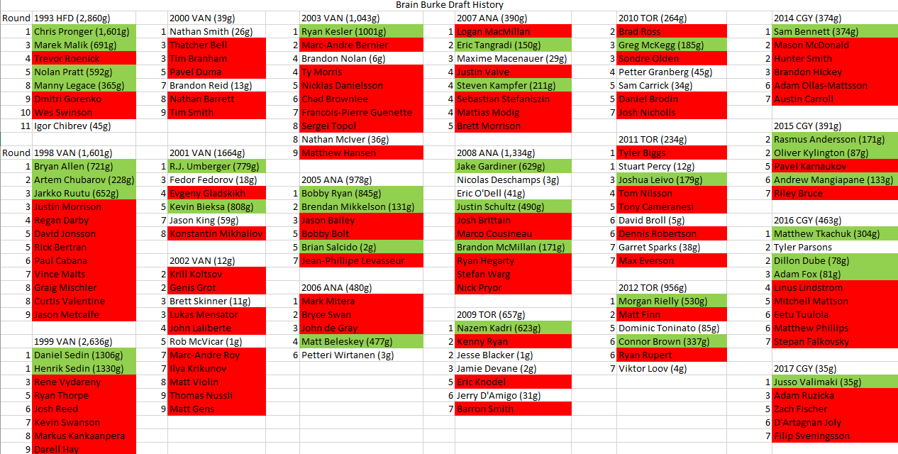 Speaking of drafts, in our analysis of these hires we decided to accumulate the draft history of both executives. When reading this, keep in mind that these numbers could change at any time if certain draftees do eventually play NHL games. In doing this analysis we looked at the total number of picks from both GMs (as well as Brian Burke’s tenure as President of Hockey Operations in Calgary) and marked just how many of the picks played a single game in the NHL, as well as how many players played in over one hundred NHL games. Lastly, we included the AB scores of any player we had in our database to reflect these men’s draft history. With that being said, the data below shows every player the new Pittsburgh tandem has ever drafted, and the information discussed earlier in this paragraph. Key: Red= Players to never play an NHL game, Green= Players that played 100+ NHL games. Draft classes are courtesy of HockeyDB. Note: For more recent draft picks, we decided to highlight some players green based on their early career trajectory. These players may not be at the 100 game mark right now; however they will be either by the end of this season or next.