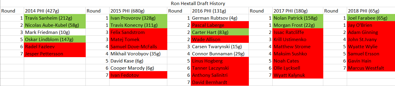 Obviously, the players from the 2017 and 2018 drafts still may need some time to develop, and the players from Hextall’s 2016 drafts that are already playing NHL games will eventually play more. Of Hextall’s 41 total picks, 16 of them (39%) have played an NHL game and 5 (12%) of them have played more than 100 games already. Of those five, four of them are first rounders. This number could increase to 13 (31%) if Mikhail Vorobyov, Carter Hart, Nicholas Aube-Kubel, Morgan Frost, Carsen Twarynski, Connor Bunnaman, and Joel Farabee all surpass 100 which is entirely possible. Of the sixteen NHL players Hextall has drafted, we have data for eight of them. Of these eight players, four are positive career AB players. These players include Travis Konecny (+2.48), Joel Farabee (+1.73), Nicolas Aube-Kubel (+1.56), and Morgan Frost (+1.39). The next few paragraphs will move on to the next step of our analysis, the actual roster construction aspect of the two executives.