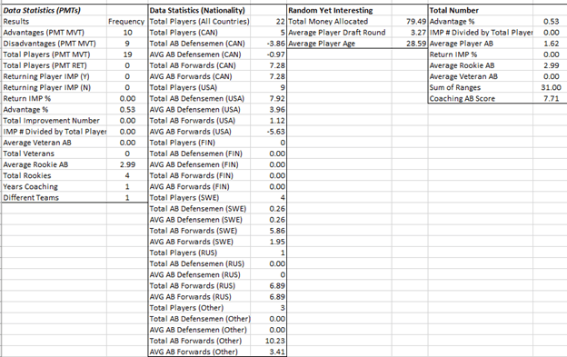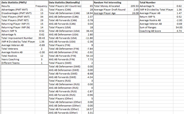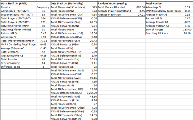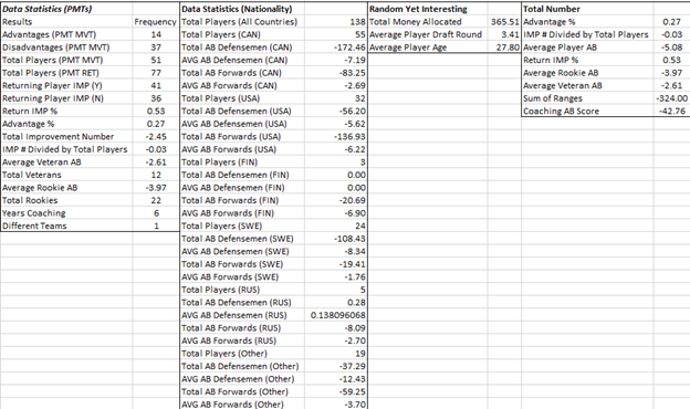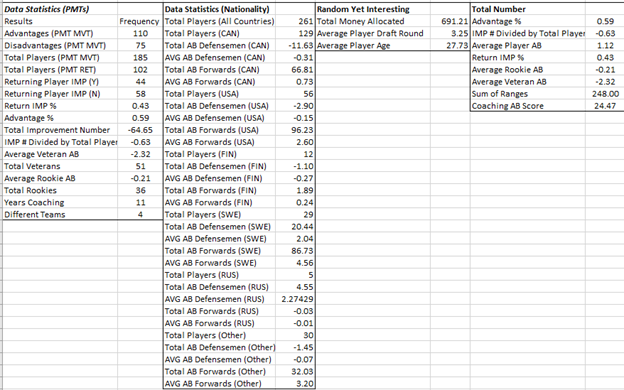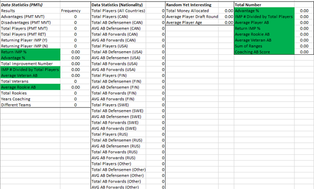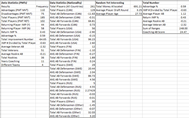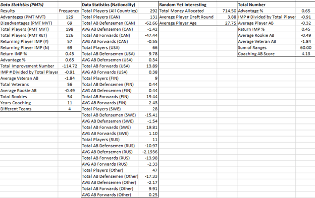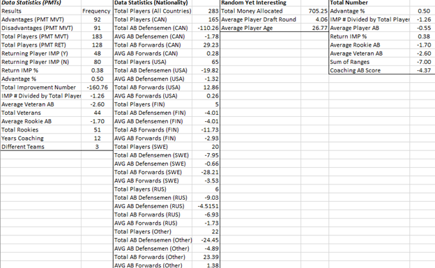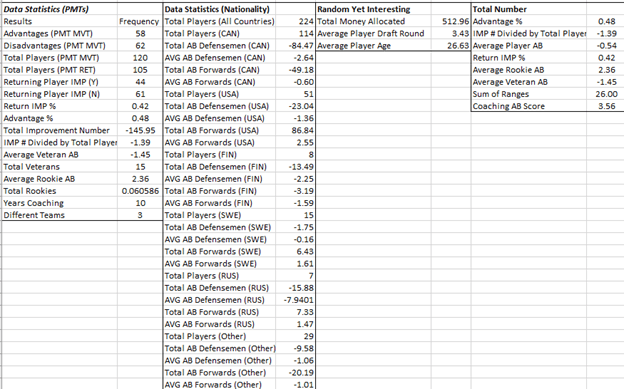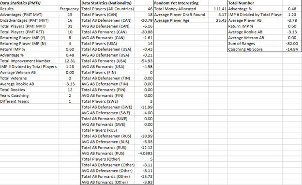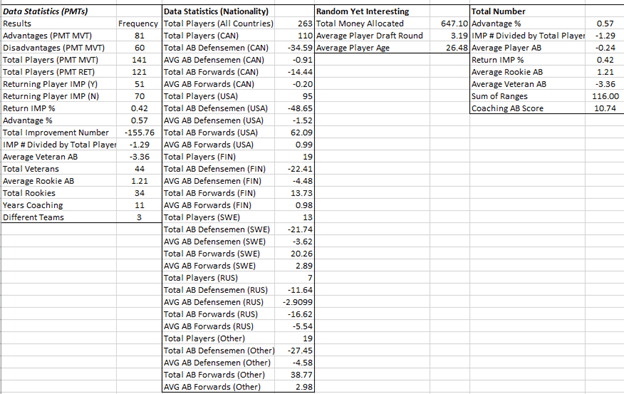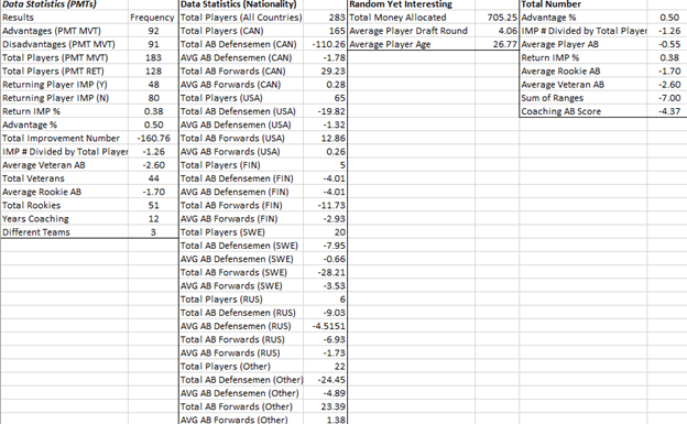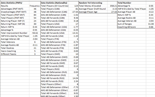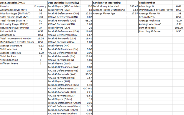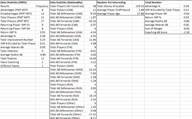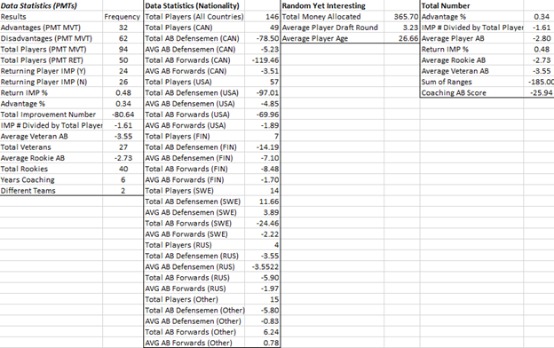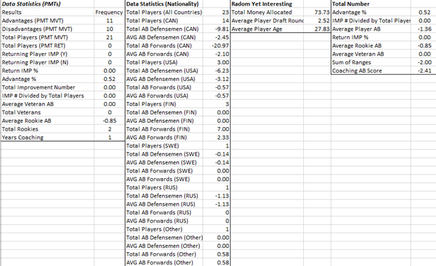 To recap the prior paragraph, here are a list of statistics included in our overall coaching AB calculation, as well as the interesting facts that we thought needed to be part of this study. The information actually factored in the formula will be highlighted in green, and the information we think will be interesting to discuss and comment on will be the information left unhighlighted. We found that the majority of players in the database are players from Canada, The United States, Finland, Sweden, and Russia, which is why they have specific columns in the nationality section of the calculation. The “Other” is any player who is from a country outside the five specified.