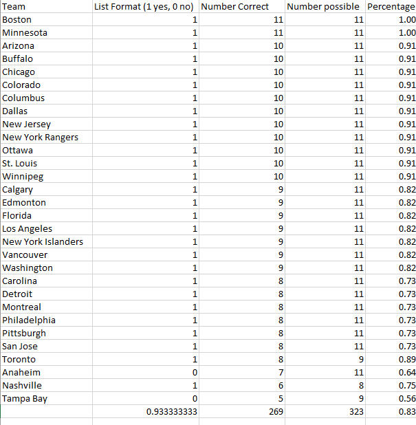 Recap: The graphic below displayed our lists accuracy to the real submitted protection lists for the Seattle Kraken expansion draft. We gave ourselves a point for each list format (8 skater, 1 goalie or 7 forward, 3 defensemen, 1 goalie option) that we had correct, as well as the actual number of protected players we were right about as well. We had two perfect lists in Boston and Minnesota and missed only one player on ten teams for an 83% overall accuracy. As we mentioned earlier in the article, we thought Tampa Bay would go for the 7-3-1 option, and we were wrong about Palat, Gourde, and Joseph being protected. In our overall calculation of accuracy, we counted Tampa Bay as 5/9 possible protections, as we docked ourselves four points for wrongly protecting Gourde, Palat, and Joseph, and not protecting Cernak.