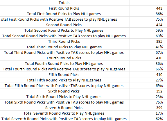 When examining the above results, we were incredibly pleased to see several high percentages in the later rounds of the draft when using TAB as an indicator of NHL games played. Positive TAB players made up an average of 69% of players who played NHL games in all seven rounds (75%, 69%, 67%, 66%, 69%, 76%, and 62% respectively). We were most astonished about its success in the sixth and seventh rounds, as 76% of the 23% of sixth-round picks to make the NHL were positive TAB players, as well as 62% of the 17% of all seventh-round picks.