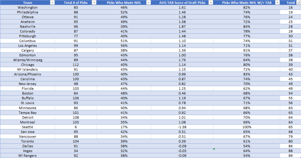 When looking at the data above, we see that Washington has the best total score, which doesn’t really surprise us. Since 2007-08, the Washington Capitals have had 46% of their draft picks reach the NHL (5% above average), 82% of which registered positive TAB scores. In this time span, the Capitals have drafted multiple NHL stars, such as John Carlson, Tom Wilson, Evgeny Kuznetsov, Filip Forsberg, and Dmitri Orlov, all of which had very high pre-NHL TAB scores.