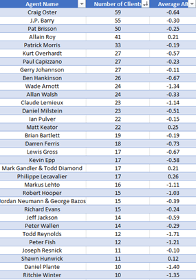 The data strongly suggests that success in the NHL is contingent on assembling a roster with players who provide both tangible and intangible value. Teams lacking players who contribute intangible value are likely to achieve only mediocrity or worse unless they adopt a roster construction philosophy akin to peers who base their decisions (partially or wholly) on data similar to the AB metric at HFFA. The introduction of the Arbitration Analyzer tool complements the information discussed in the preceding section, serving as the primary instrument for contract analysis and guiding GM decision-making in the free-agent market. The Arbitration Analyzer tool offers a unique opportunity for player representation firms as they negotiate contracts on behalf of their clients. Having access to this information could prove invaluable during arbitration proceedings, as many NHL agents have indicated that arbitration often hinges on the presentation of compelling numerical evidence, even in cases where the arbitrator may lack in-depth knowledge of hockey. This represents the most immediate practical application of my research at a professional level, as it enables the preparation of detailed arbitration cases using AB information. Furthermore, akin to the GM and Coach study, this research investigates which individual agents represent the most successful AB-rated players and which agents are particularly adept at securing favorable contracts for their clients using the Arbitration Analyzer and AB metric. The list provided below is not a ranking of specific agents but rather a compilation based on the number of clients each agent represents and the average AB metric of their clientele.