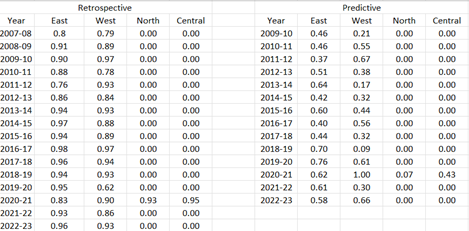 The ensuing table presents the results of the AB score analysis on both retrospective and predictive bases, spanning the period from 2007 to the present.