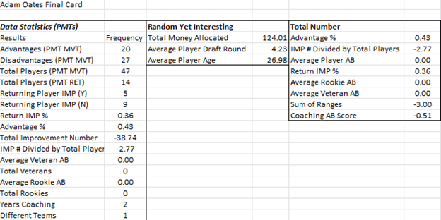 The methodology was as follows; First, of the 16 years of potential coaching time, several coaches received credit for years in which they did not actually finish the season employed by the organization. In these instances, the coach under examination either coached a majority of the season’s games, making the player’s individual scores a greater representation of his work or took over the position in the second half of a season despite coaching fewer games, potentially making the player’s individual scores a more recent reflection of said coaches’ work. A perfect example of this dilemma is the case of the 2020-21 Buffalo Sabres. The Sabres fired coach Ralph Krueger 28 games into the 56-game regular season, appointing Don Granato with the interim tag. Due to the fact that Granato’s 28 games were the last 28 games of the season, we infer that the players’ individual scores were more of a reflection of Granato as opposed to Krueger due to the recency. After thoroughly examining all of these cases, specific coaches were allocated to each player’s AB score recorded in the database. This was done with the aim of determining which coaches were responsible for guiding each player and when this guidance took place. In total, there were 11,624 players included in this database. There are some novel statistics specifically designed for this project as well. These statistics encompass Player Movement Trackers (PMTs), Advantage Percentage, Return Improvement Percentage, and Average Improvement Number.