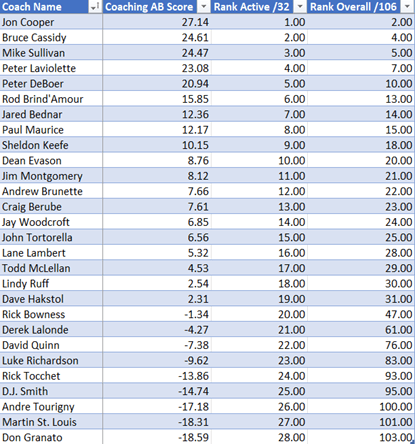 Obviously, not all coaches have the same system or even ways to motivate and get the most out of their players. The goal of this study was to identify which coaches were able to generate results as far as AB is concerned, and I took team AB performance into account during this evaluation. Below is a ranking of the league’s active coaches who are not entering their first season. Anaheim’s Greg Cronin, Calgary’s Ryan Huska, Washington’s Spencer Carbery, and Columbus’ Pascal Vincent will not be included in this ranking for that reason, as there is yet to be any AB data on them.
