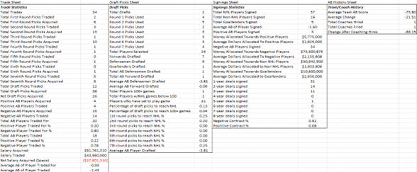 The research involved with this study was aimed to identify which GMs value similar traits and characteristics of hockey players as dictated by AB. The decision-making of every GM was evaluated in trades, signing off free agents, making draft selections, and the results of their coaching moves. The full list of statistics compiled on all seventy-nine men is shown below, as the graphic actually depicts all of Arizona GM Bill Armstrong’s decisions in relation to AB and overall.