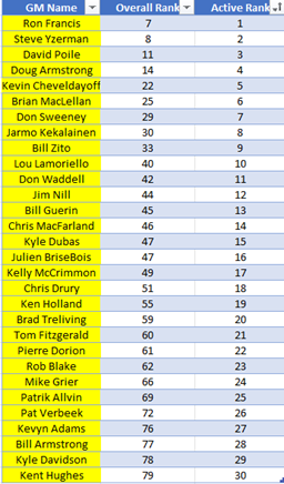 Similar to coaches, all GMs are different in their managerial actions due to a variety of factors. These could include ownership situation, salary cap configuration, talent pool, or simply managerial tendencies or strategy. Below is a ranking of the active GMs in the NHL today based on a variety of criteria shown in the graphic on the previous page.
