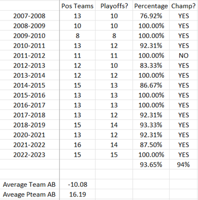 As the table shows, the significant majority of AB-positive teams qualify for the playoffs, an average of 93% throughout the sixteen-year period. 94% of champions over the course of the study were positive AB teams, and the higher of the two finals teams has won the Stanley Cup in 14 of the 16 seasons (the two Los Angeles wins being exceptions).