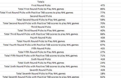 - Percent of Positive TAB Players in total draft to play NHL games.