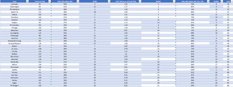 These results illustrate which teams have been the most successful at drafting and development over the last 17 drafts in accordance with TAB. The criteria used to determine this ranking include a sum of rankings formula of three specific qualifications (Picks who made the NHL, AVG TAB Score of Draft Picks, and Picks who made the NHL with positive TAB Scores). Each team was ranked on those three criteria, and then those ranks were added and sorted from least to greatest, as lower rankings meant better performance. It was not surprising to see recent Stanley Cup Champions and perennial contenders of the last 17 years top the list, as the Colorado Avalanche, Washington Capitals, Anaheim Ducks, and Chicago Blackhawks have had unquestionably great success over this time span. It’s also very interesting to see that of the 39% average of total picks to make the NHL by each organization, 72% on average recorded positive pre-NHL TAB scores.