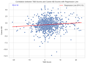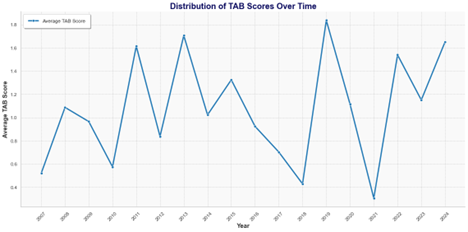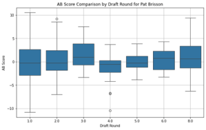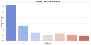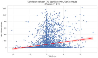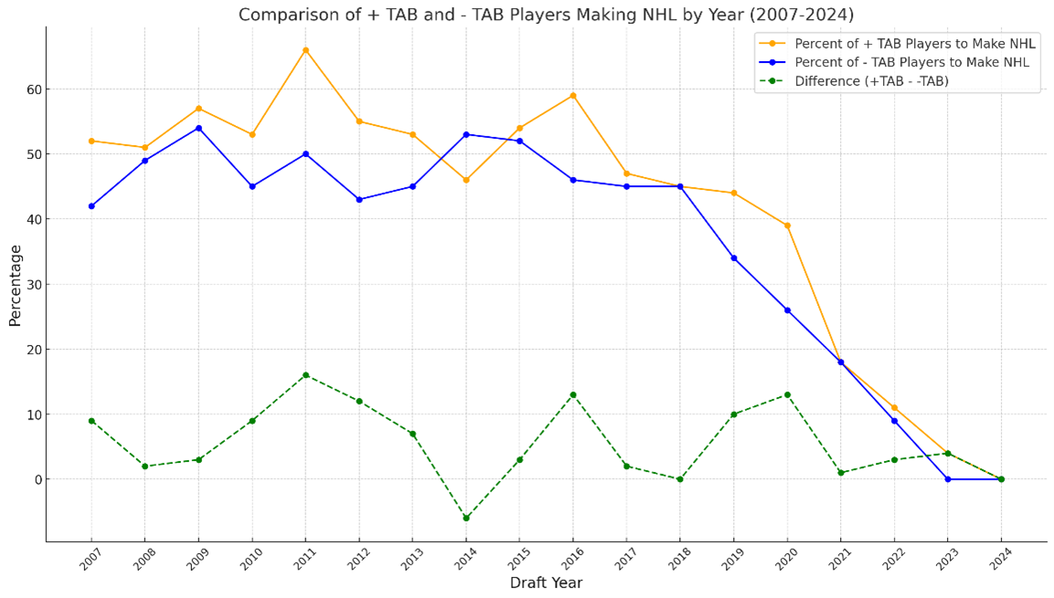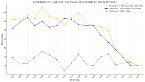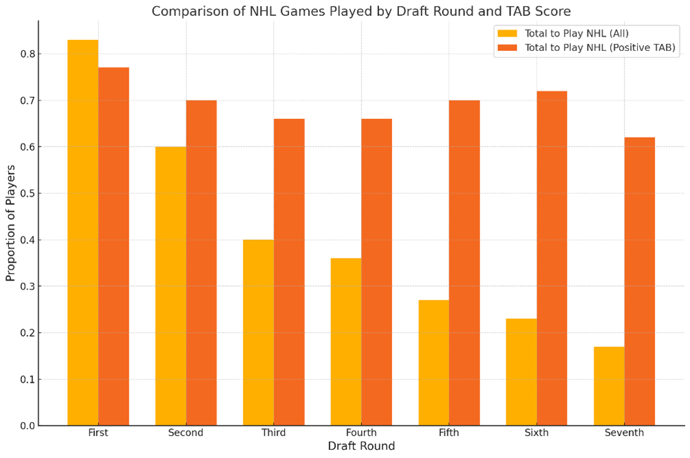 A pivotal development in the AB Score’s evolution was its adaptation for pre-NHL scouting through the introduction of the Tentative AB Score (TAB). While still rooted in the principles of the original AB Score, TAB was designed to assess the early potential of junior players and draft prospects. Although its implementation is still in its early stages, analysis over the 17-year span of NHL data (2007-08 to 2023-24) has begun to highlight its potential value. Preliminary findings suggest that players with higher TAB Scores tend to have stronger long-term NHL success, making it a promising tool for teams seeking to refine their scouting and draft strategies. The TAB metric has shown promise in uncovering patterns that align with successful NHL careers, particularly in evaluating late-round prospects who may otherwise go unnoticed.