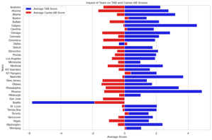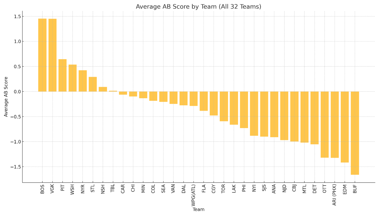 From an operational standpoint, this graph underscores the critical role of long-term planning and organizational consistency. Teams with high Total AB Scores frequently benefit from cohesive strategies across all levels of hockey operations, including drafting, development, and player retention. In contrast, franchises with persistently low AB Scores often struggle due to fragmented approaches, insufficient player pipelines, or ineffective leadership. By leveraging the insights provided by AB metrics, these teams can identify specific areas for improvement and implement data-driven strategies to optimize roster performance.