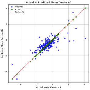 The relationship between a team’s Total AB Score and its Mean Wins highlights the AB framework’s predictive ability in evaluating team success. Total AB Score is a cumulative metric, integrating individual player contributions into a holistic team assessment. The total number was calculated by taking each NHL franchises’ final team AB score each season from 2007-08 to 2023-24. Teams with higher Total AB Scores demonstrate a clear advantage in achieving regular-season success, as shown in the scatterplot. The data reveals a statistically significant positive correlation, with a calculated coefficient of 0.78 across all data points. This underscores the reliability of Total AB Scores as a consistent indicator of regular season wins.