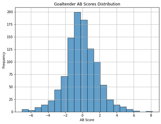 The symmetry of the histogram validates the AB framework’s design, particularly its ability to evaluate players across all positions and roles without systemic bias. This feature is critical for ensuring that metrics derived from the AB framework are applicable league-wide, allowing general managers to compare players with vastly different responsibilities, such as a scoring winger versus a stay-at-home defenseman. Additionally, the normal distribution supports the reliability of the metric for modeling and predictive analysis, ensuring that the AB framework can function as both a diagnostic and planning tool for hockey organizations.