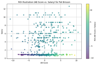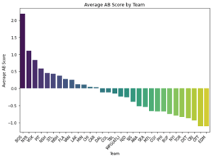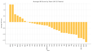 For teams on the playoff bubble, these insights are particularly valuable. By targeting improvements in their Total AB Scores, either through strategic acquisitions or player development initiatives, these teams can shift from mediocrity to playoff contention. Importantly, GMs can achieve significant gains not only by adding high-performing players but also through subtraction—replacing below-replacement-level players with players performing at a baseline level. This incremental improvement, though seemingly minor, can yield substantial benefits in Total AB Score and overall team performance. Such moves are especially critical for teams struggling with depth issues, where upgrading even marginal contributors can have a cascading positive effect on roster efficiency.