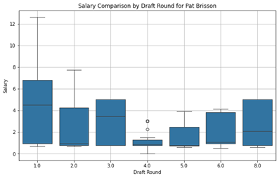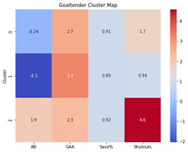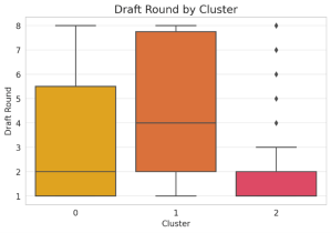 The boxplot for draft round by cluster indicates a clear distinction in where different types of players are typically selected in the NHL Draft. High-impact players in Cluster 2 are overwhelmingly early-round selections, with most being drafted in the first or second round. This aligns with expectations, as teams prioritize elite talent at the top of the draft, and these players are the ones who go on to become franchise cornerstones. The narrow range in Cluster 2 suggests that very few late-round picks or undrafted players reach this level of impact, reinforcing the importance of securing top-tier talent through early draft selections.