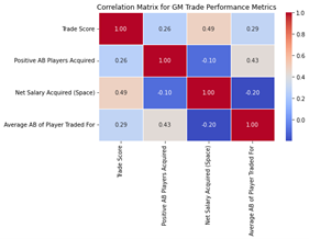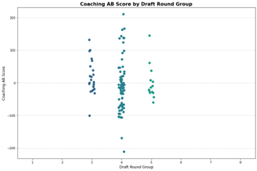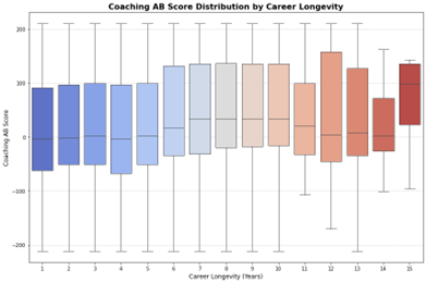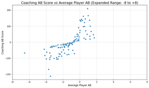 Simultaneously, the AB framework expanded its reach into coaching and management evaluation. The Coaching AB Metric provided insights into how effectively coaches maximized player performance and minimized systemic errors. Findings from the 17-year dataset revealed that teams with high-scoring coaches consistently outperformed their peers in both the regular season and playoffs, underscoring the importance of strategic alignment with AB principles. Similarly, the General Management AB Metric assessed decision-making at the executive level, offering a detailed analysis of roster construction, trade efficiency, and salary cap optimization.
