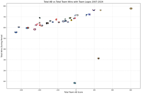 The scatterplot comparing Total AB Scores to total wins over a 17-year period provides a comprehensive lens through which to examine the relationship between roster composition and long-term success. By incorporating team logos into the visualization, the chart offers immediate clarity, highlighting key outliers while drawing attention to overall trends. Teams such as the Boston Bruins and Vegas Golden Knights emerge as examples of success stories, showcasing high Total AB Scores that align with substantial win totals. These franchises reflect the hallmarks of organizational consistency, including strong player pipelines, strategic roster construction, and effective coaching.