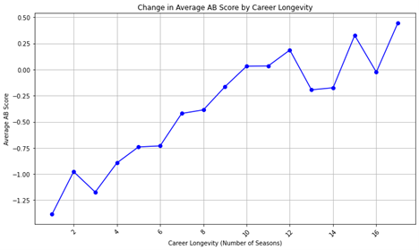 The line graph illustrating changes in average AB Scores over time reveals valuable trends in league-wide performance and highlights the impact of external factors on player development. By examining these fluctuations, we gain a deeper understanding of how systemic changes in the NHL influence player contributions and team success.