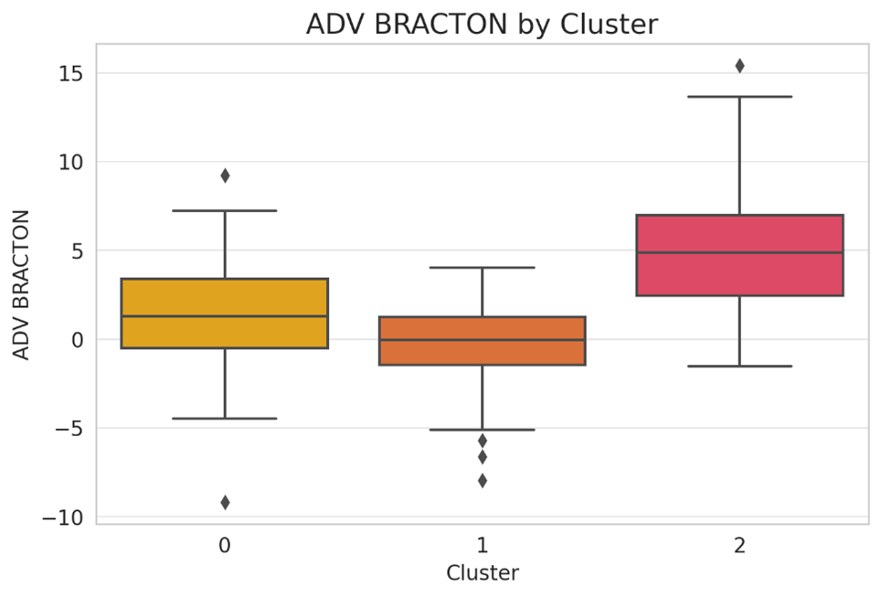 Cluster 1 players have the lowest AB scores on average, with a significant number of negative values and a tighter range around the median. The presence of more negative AB players in this group suggests that these are often younger or lower-salaried role players who may not have the same impact as those in Clusters 0 and 2. However, their inclusion on championship teams highlights that teams still need cost-effective contributors to fill out their rosters, even if they do not individually drive performance.