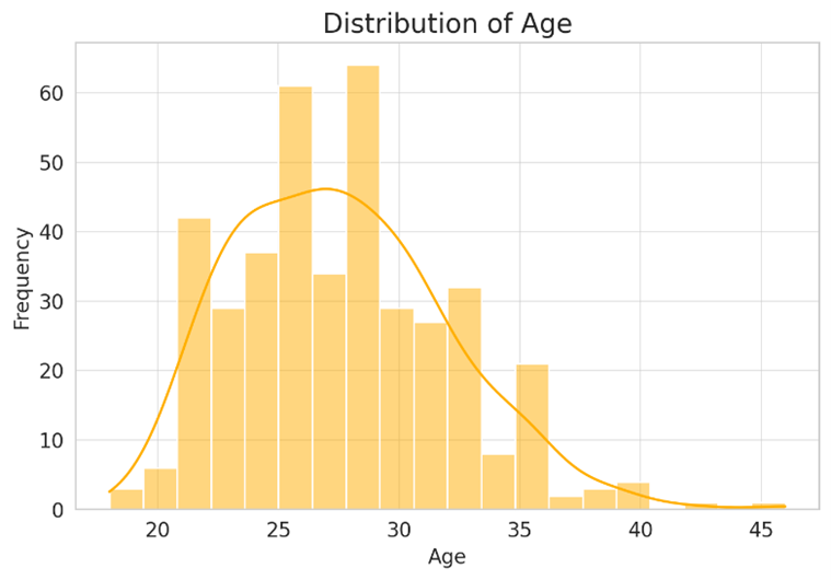 The age distribution of championship players is slightly right skewed, indicating that teams tend to lean toward experienced players while still incorporating younger talent. The majority of Stanley Cup winners fall within their prime playing years, typically in the mid-to-late 20s, where players have developed both the physical and mental aspects of their game. The peak of the distribution around ages 26 to 30 suggests that teams rely on players who have reached a balance between skill development, physical conditioning, and game experience.