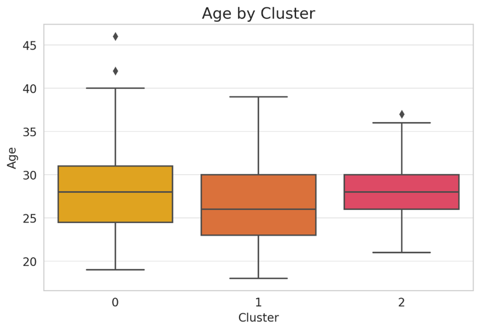 The boxplot of age by cluster further illustrates the relationship between player roles and career stages on championship teams. Cluster 2 players, who are typically high-impact stars, tend to fall within the prime age range of 25 to 30, reinforcing the idea that championship teams are driven by players at their physical and skill-based peak. The relatively tight distribution of ages within Cluster 2 suggests that these top-tier players are often in their most productive years, where they can contribute at an elite level without the decline in performance that comes with aging.