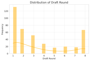 The histogram of draft rounds reveals that championship rosters are composed of a mix of early draft picks and later-round selections who have developed into key contributors. The highest concentration of players comes from the first round, which aligns with expectations, as elite talent is most often selected early in the draft. These high-end players are typically the foundation of championship teams, providing star power and high-impact performances that drive success.