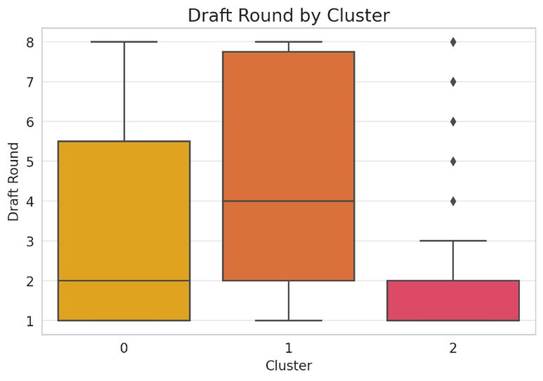 Cluster 1, which consists of younger or lower-impact role players, has the widest spread of draft positions, including many undrafted players. This suggests that while early draft selections tend to become elite players, successful teams also find value in later-round picks or undrafted players who develop into key contributors. These players often take longer to reach their peak but can become important depth pieces, providing valuable production at a lower salary cap hit.