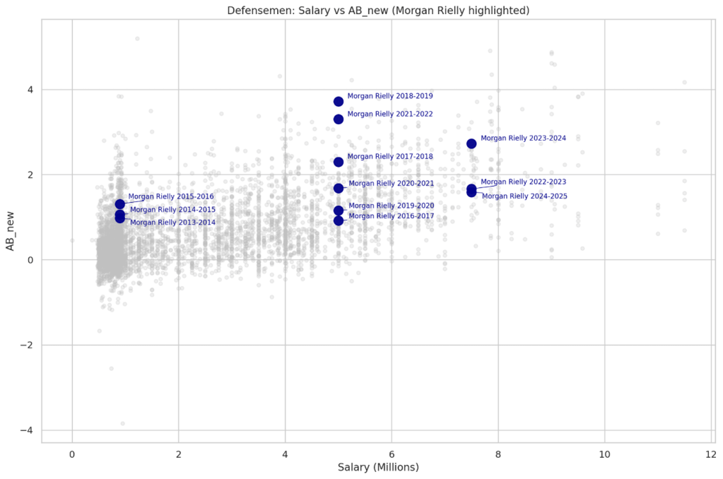 As shown above, Rielly peaked in 2018-2019 and again in 2021-2022. These seasons saw him finish 5th and 11th in Norris Trophy voting, respectively, demonstrating that Rielly established himself among the best at his position, but not quite at the top tier. However, the graph shows several concerning conclusions. First, Rielly has had a wildly inconsistent, yet still above-replacement-level, career. Second, he is in the post-30 decline that affects many players. When calculating his AB_New for the 57 games played so far this regular season, the result is a 1.06, which is his lowest recorded total since 2016 if it holds. Outside of those 2018-19 and 2021-22 seasons, his numbers profile him as a strong second-pairing defenseman rather than a true #1.
