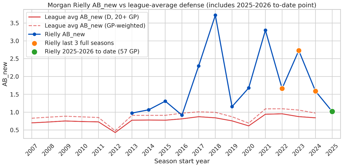 As shown above, Rielly peaked in 2018-2019 and again in 2021-2022. These seasons saw him finish 5th and 11th in Norris Trophy voting, respectively, demonstrating that Rielly established himself among the best at his position, but not quite at the top tier. However, the graph shows several concerning conclusions. First, Rielly has had a wildly inconsistent, yet still above-replacement-level, career. Second, he is in the post-30 decline that affects many players. When calculating his AB_New for the 57 games played so far this regular season, the result is a 1.06, which is his lowest recorded total since 2016 if it holds. Outside of those 2018-19 and 2021-22 seasons, his numbers profile him as a strong second-pairing defenseman rather than a true #1.