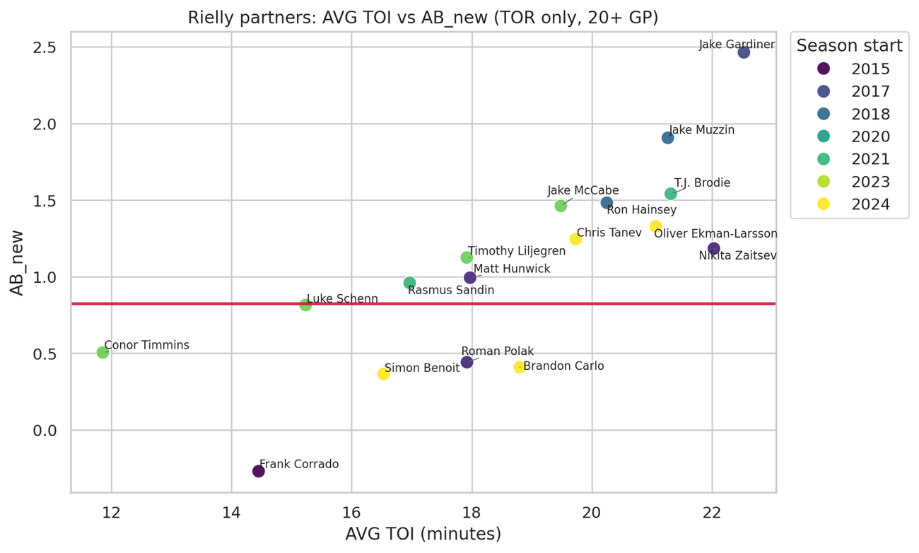 The insights here are disturbing, as very few of these players were high-impact defensemen or significantly older and past their prime when acquired by the Leafs, such as Chris Tanev and Oliver Ekman-Larsson. Jake Gardiner actually posted the best recorded AB_New scores of all of Rielly’s partners, and he was never considered to be a defensive stalwart. Most of the names on this list clustered around league average or fell below replacement-level, as the graph illustrates. We’ve established that Rielly hasn’t been producing as his role suggested he should have the past several years, yet the organization pairs him with players who weren’t needle movers either.