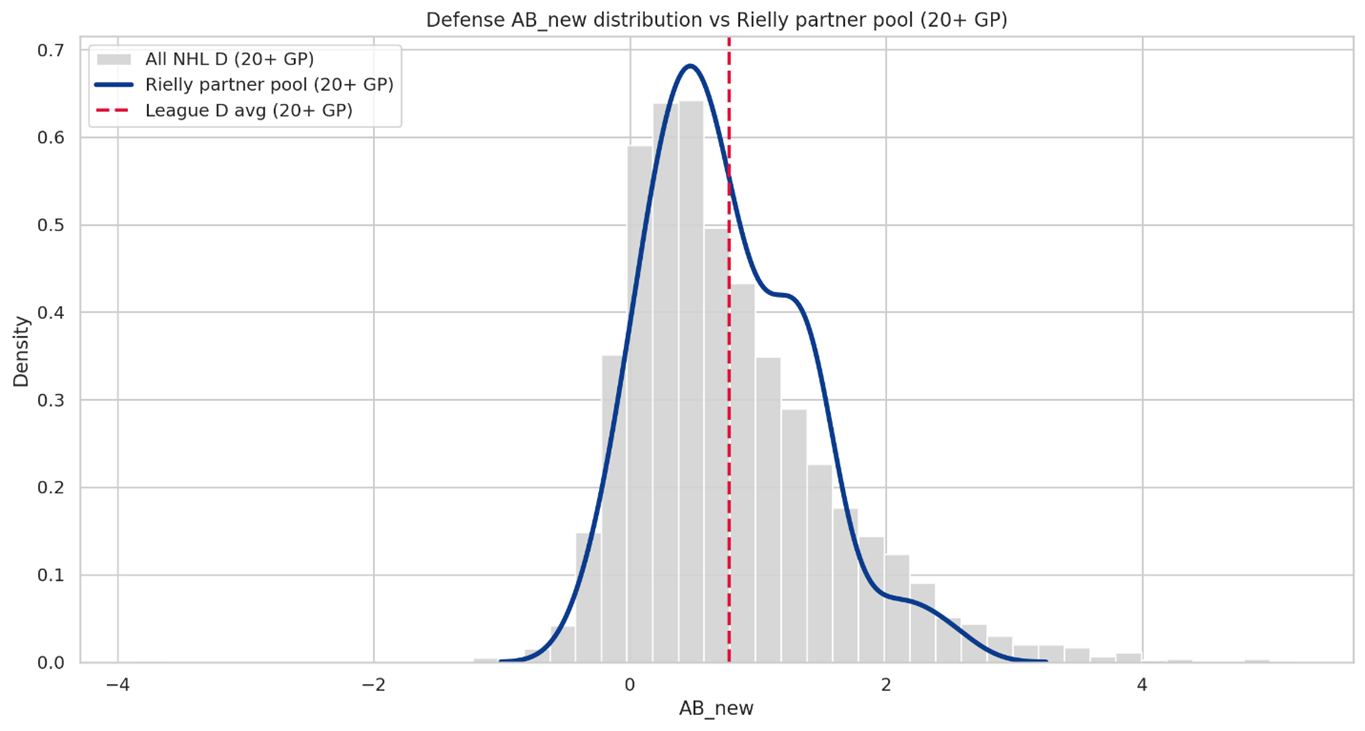 The graph above reinforces this point. When we look at the AB_New values of Morgan Rielly’s defense partners and compare them to all defensemen in the eighteen-year study who played over 20 games, the partner curve falls almost exactly on league average. This isn’t a criticism of the nineteen players listed as former or current Morgan Rielly defense partners. In fact, many of them were reliable, competent professional hockey players with the Leafs, but needed to play a role that didn’t fit their skillsets, or Rielly’s. This is incredibly important, as top defensive pairings are supposed to either be elite with elite or elite with an elite complement. In the modern era, it’s fair to say that the Leafs have never had either configuration. Instead, they forced good, above-replacement, but not elite players, into elite roles against better competition. This is perhaps why Rielly himself is -17 in the year so far in 2025-26, as he plays unsuccessfully against the opposition’s best players despite needing a much more structured environment to utilize his skillset at this current time.