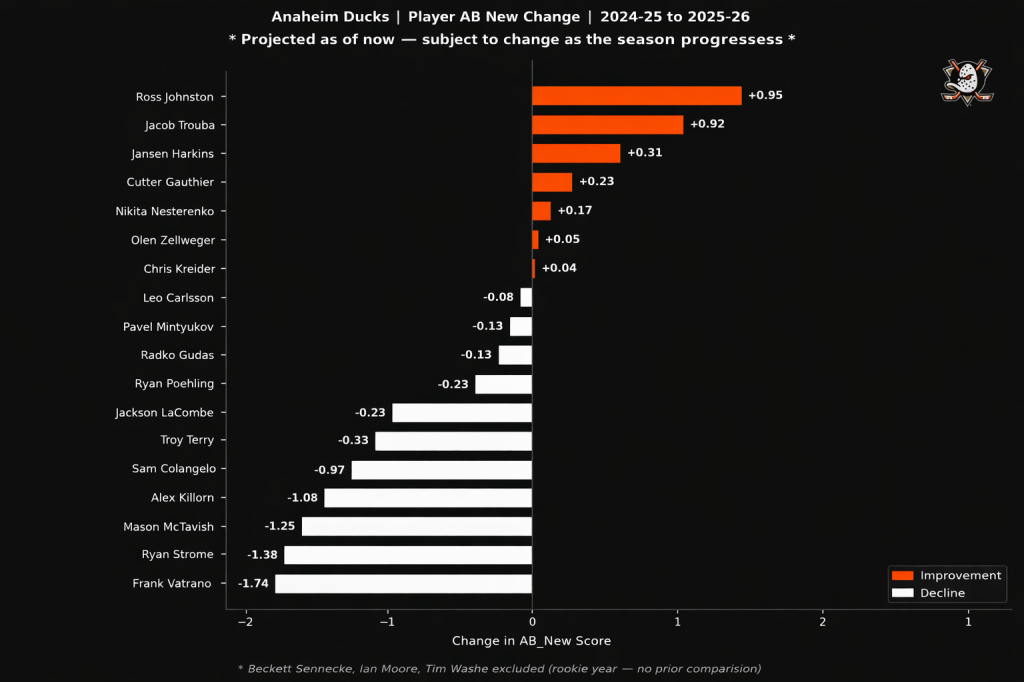 The Anaheim Ducks fired former Head Coach Greg Cronin on April 19th, 2025, leaving a roster filled with young talent and cost-effective veterans looking to take the next step. In the 57 total games played so far, the Ducks have 23 eligible AB players, 17 of whom are considered returning players, 3 rookies with no available prior AB data, and 3 newly acquired players. These include Mikael Granlund of the Dallas Stars, Ryan Poehling of the Philadelphia Flyers, and Chris Kreider of the New York Rangers. The graph below shows the differences in the 2024-25 AB_New scores for the 20 eligible players who have played in each of those seasons up to this point.
