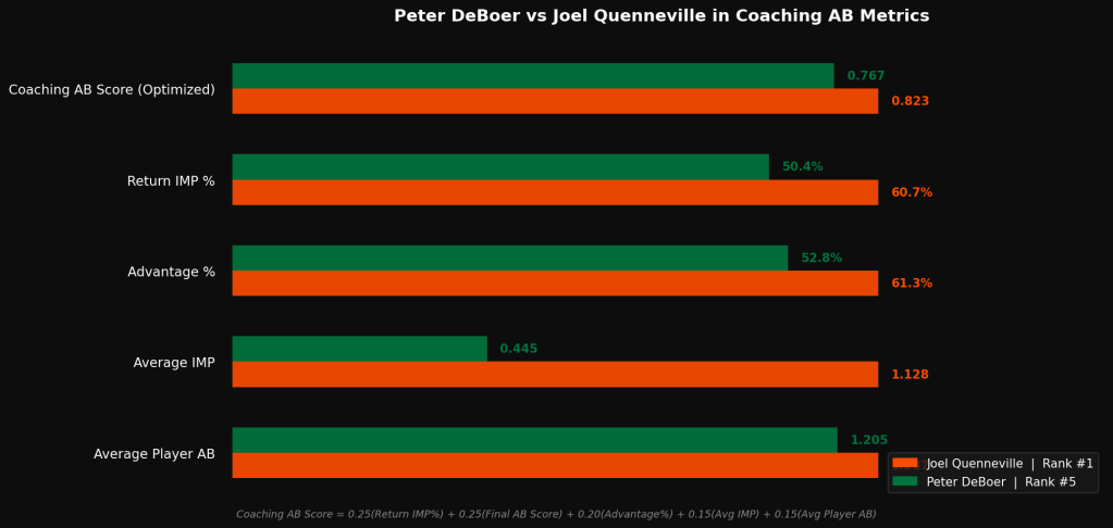 This process produced the new Optimized Coaching AB Score metric, with the formula being 0.25 × norm(Return IMP%) + 0.25 × norm(Advantage%) + 0.20 × norm(IMP / Total Players) + 0.15 × norm(Avg Player AB) + 0.15 × norm(Sum of Ranges). With that being said, Quenneville’s impact can now be fully dissected.