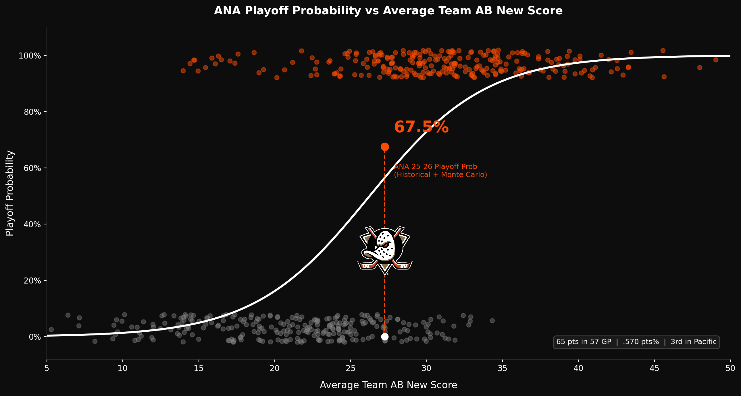The projection model shows that the Ducks’ final projected team AB_New Score is approximately 27. This supports the theories suggested in the previous paragraphs, which indicate that Quenneville and the Ducks’ player development are on the right track. The model’s projection of nearly an 8-point jump from the 19.13 registered score through 57 games to 27 at the end of the season is banking heavily on Quenneville’s coaching history to deliver the anticipated results through the final stretch. However, based on the results of the Monte Carlo simulations and the historical AB data, the model says the Ducks have a 67.5% chance of reaching the playoffs at their current Western Conference standings and points pace this season. Along with Dan Muse, who’s having a tremendous season leading the Pittsburgh Penguins, Joel Quenneville, to me, should be one of the frontrunners for the Jack Adams trophy for Coach of the Year. The rationale is perfectly illustrated by the model: a “more likely than not” conclusion that, this far into the year, Quenneville breaking the Ducks’ non-playoff qualification streak would be among the more underrated league accomplishments if it happens in the 2025-26 season.